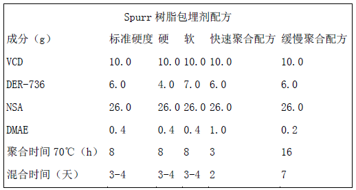 這是1969年由Spurr推薦使用的包埋劑,所以也稱Spurr樹脂。它含有兩個環(huán)氧基,是一種低粘度(25℃時,7-10cP)的環(huán)氧樹脂。由于具有粘度低的特點(diǎn),所以近年來一些實(shí)驗(yàn)室已開始使用它。其配方可按下表中各種成分的比例,即可獲得不同性能的包埋塊。其配方如下: