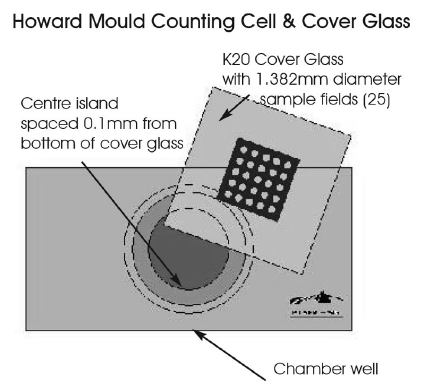K20這個蓋片的設(shè)計很巧妙,35x35mm大小的蓋片中央陳列了25個直徑為1.382mm的圓形透光區(qū)域,這保證我們觀察一個區(qū)域時的視野實(shí)際長度是1.382mm。這也是霉菌計數(shù)要求的標(biāo)準(zhǔn)視野大小。