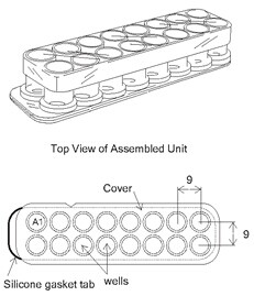 蓋玻片上的腔室共16個,分2排,各8孔(如圖示),每孔的內(nèi)直徑6mm。設計的每孔體積和孔距與標準96孔板的相同,無細胞毒性的硅膠試劑壩(silicone well gasket)可以與上層聚苯乙烯材料的腔室(the upper structure,厚0.5mm)和基層的硼硅酸鹽蓋玻片(the substructure,厚0.16-.19mm)均形成密封。有上層腔室時每孔體積250µl,去掉上層腔室后每孔體積9µl。