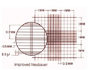 3.萊卡血細(xì)胞計(jì)數(shù)板(Metallized Hemacytometer(or Reichert Bright-Line Counting Chamber):金屬亮線(xiàn)、 改良牛鮑氏型,深0.1mm。特殊的進(jìn)液V區(qū)用白金鍍過(guò),對(duì)比度鮮明易識(shí)。因其由Leica原創(chuàng),故名萊卡血細(xì)胞計(jì)數(shù)板,主要為了血小板的計(jì)數(shù),以及塵埃/酵母聚集體的準(zhǔn)確計(jì)數(shù)而制造,帶有“Reichert”字樣。 整套計(jì)數(shù)板包括計(jì)數(shù)板一塊,0.4mm蓋玻片兩片,紅細(xì)胞移液管,白細(xì)胞移液管,血球計(jì)數(shù)板盒。