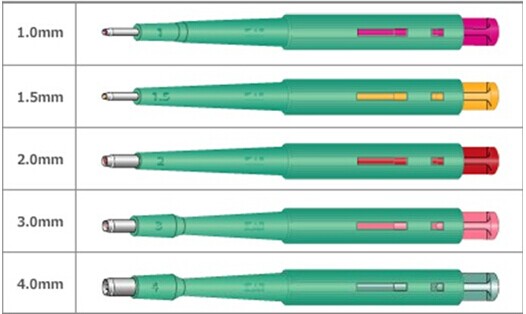 截取細(xì)微樣本的得力助手!光滑鋒利的刀頭,精巧的樣本彈射,以及拿捏部位的防滑設(shè)計等均獨(dú)具匠心!每種尺寸清晰標(biāo)于桿上,不同顏色的按鈕便于辨識。