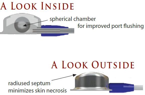 三、SwirlPort:具有球形腔室的輸液港,SwirlPort為研究人員提供了新的輸液港技術,球形腔室的形狀消除了所有出現(xiàn)“潴留漿的角落,與類似大小的輸液港比較,減少了腔室整體體積。這種腔室的形狀已被證明對腔室沖洗體積有可測量的影響,該體積必須用來清潔”腔室的血液和藥物殘留量。與傳統(tǒng)端口相比,球形的腔室沖洗流量最低,且該流量與沖洗流速無關。目前可以提供三種大小:大-MAX(0.53ml);中-MID(0.33ml);小-MIN(0.18ml)。