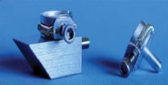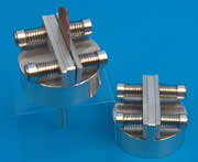 這種固定器是用來固定各種垂直的薄的樣本,它的直徑為25mm,厚度為10mm。虎口能夠夾持最薄3mm厚的樣本。彈簧保證樣本垂直,以便對它的橫截面進行研究。這種固定器對于研究硅片橫截面是非常有幫助的。通過適配銷和你的儀器連接。