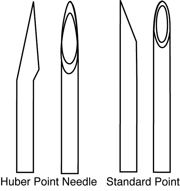 提倡用此針配套植入式輸液港或者肝素帽使用,可以大大延長植入式輸液港或肝素帽的壽命。普通注射針和Huber注射針對植入式輸液港的隔膜進行了穿刺落屑比對試驗,結(jié)果表明,采用Huber注射針穿刺后的落屑數(shù)均明顯少于普通注射針的試驗結(jié)果(huber注射針又稱不落屑針)。這是因為Huber注射針的針尖采用了獨特的幾何形狀,防止或者減少了取芯作用(針頭穿過材料時一部分進入到針尖附近腔中的現(xiàn)象)。