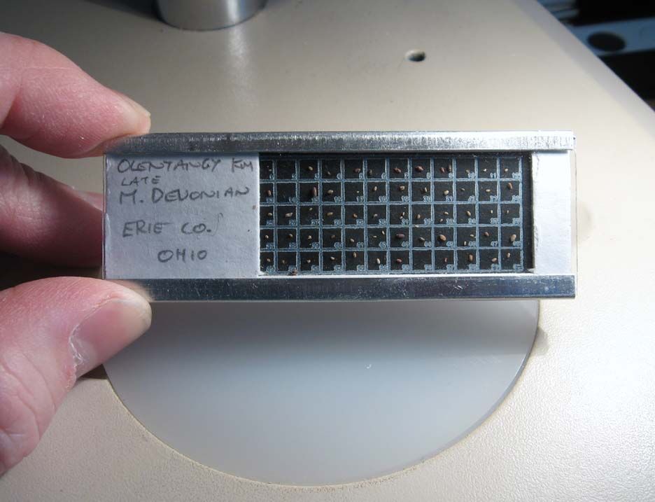 古生物研究中常常樣本是很小的微體化石,這里介紹一款傳統(tǒng)的微化石載物片,主要用來裝載微化石樣品。這個載物片與傳統(tǒng)的載玻片大小一樣,主體主要由三部分構成:底板托是鋁材料制成;裝載者是一些帶有孔的硬紙板,孔有方形和圓形,有單孔或者多孔(有黑色和白色孔),有與硬紙板大小一樣的玻璃蓋。使用時,玻璃蓋片蓋上載樣品的硬紙板,滑入鋁制的底板托中。76 mm (L) x 27.2 mm (W) x 4.5 mm (H)。