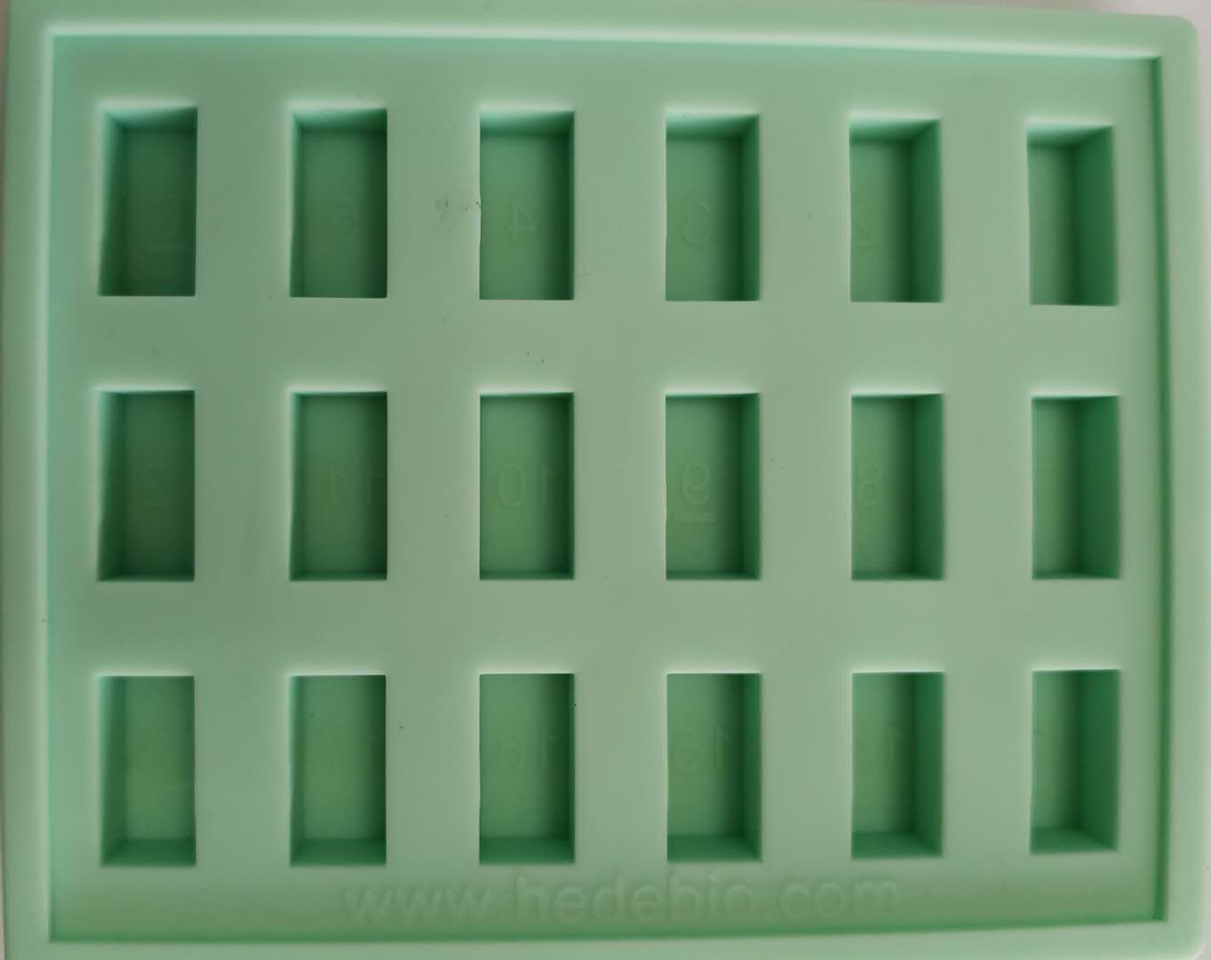 淡綠色的18槽硅膠模具,長寬為130×100mm,槽大小為20×10,深10mm,可以與骨髓塑料切片試劑盒配套使用,也可以用于JB-4等樹脂包埋。